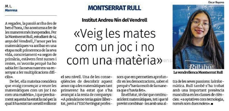 Montserrat Rull es l’Ambaixadora des del Vendrell, cursa el 4º de ESO a l’Institut Andreu Nin, a mes de complementar-ho amb diversos programes i cursos de preparació tant de matemàtiques com d’informàtica, a la Universitat Politècnica de Catalunya de Barcelona, perquè te molt clar la direcció del seu futur, la implicació de les matemàtiques i la informàtica en ell.